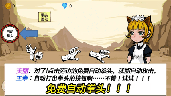 一款暴漫风格的文字冒险类游戏,游戏中玩家化身为一个拳头,需要不断提升拳头的等级和能力,用拳套来对抗各种敌人,带来爽快的战斗打击感体验,还有不同样式的拳头可以解锁来使用。