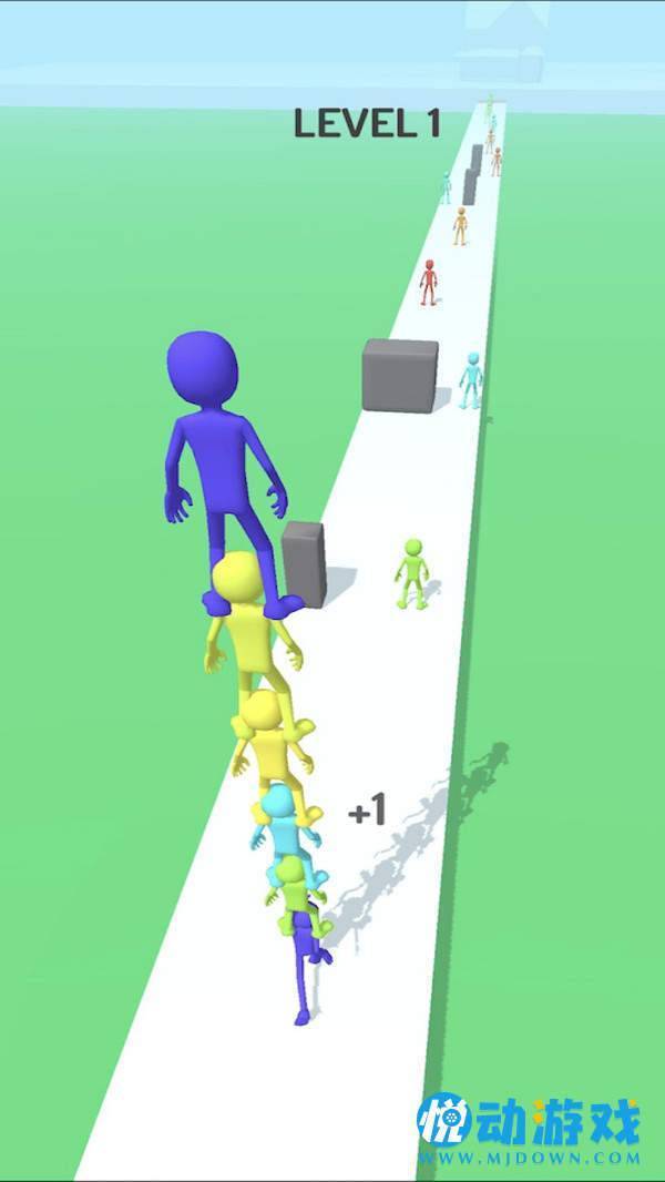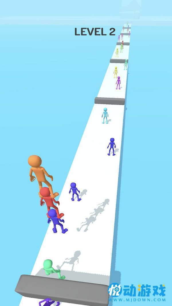 人类桥梁是一款利用多人来堆叠的游戏,那样很多人就可以化作一个桥梁,就算前面遇到什么样的障碍物,也是可以直接架设人梯来通过的,不过每一次通过就会减少同样高度的人,所以在行走闯关的时候,也要及时的收集人群,这样才能保障最后顺利通过关卡。