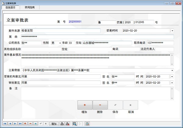 交通执法文书管理系统是一套完整精致的案件管理系统。案件录入包括“立案审批表”、“现场笔录”、“询问笔录”、“案件处理意见书”、“违法行为通知书”、“陈述申辩书”、“文书送达回证”、“行政处罚决定书”、“处罚结案报告”、“备考表”每个文书下都有相对应的文书报表,文书报表即可单个打印也可整套打印。通过文书进度可以查看每个案件的进展情况。