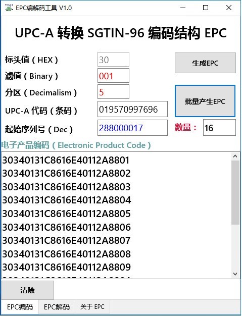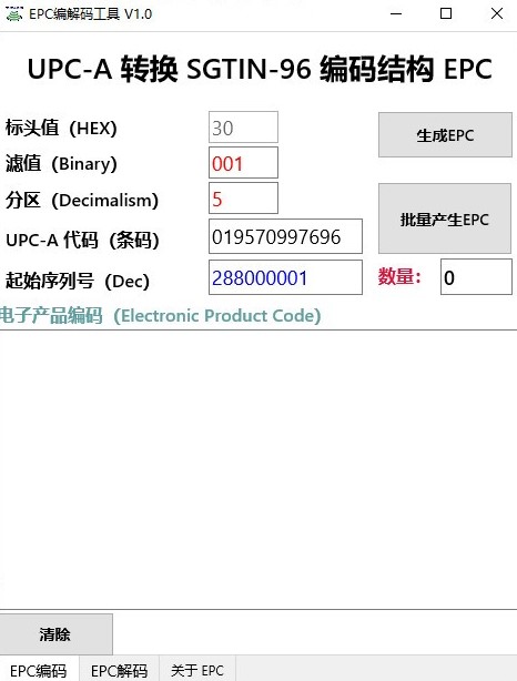 EPC编解码工具是一款很不错的电脑软件,EPC编解码工具应用程序可以将普通的二维码UPC-A数据转换为EPC编码数据。 用户也可以手动输入12位UPC-A数据来转换EPC编码。 快点前来本站下载使用吧。
