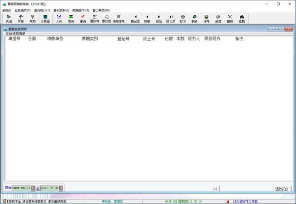 4.票据以本为基本计量操作单位进行入库,领购,退回,缴销业务,即只能整本整本进行,如需单份号码操作,请将票据种类中的”份/本”,设为1