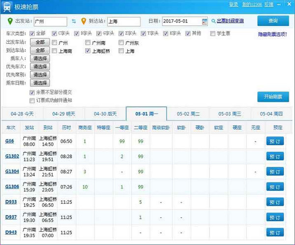 如果想要的车次席位没有票了,可以使用自动刷票功能,可以同时选择多车次、多席位、多日期、多乘客。