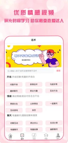 恋爱聊天术app有着丰富的聊天干货,海量的精选话术,精彩的视频教学,实用的恋爱工具,有效的恋爱秘籍,唯妙的恋爱绝招,导师们的倾城奉献,帮助你解决所有情感上遇到的各种实际问题。