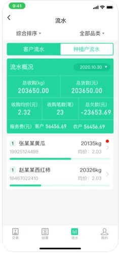 通过流水页面可以详细的展示货主的收购情况。可通过微信分享账单给货主,让账目明明白白;还可以实时查看每天,每月,每年的交易数据。