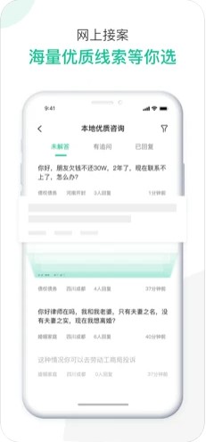 2、律师端是您可以使用律师律师端随时随地在线处理平台线索,移动化办公方式使您的工作效率更加便捷,能够极大地缩短您的处理时间,打造高效管理模式。