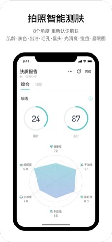 2、【智能分析】从肌龄、肤色、出油、痘痘、黑头、毛孔、光滑度等多个角度,全面分析肤质;