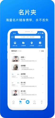 扫描保存的所有联系人,登录账号可实时同步到云端,安全备份永不丢失,换手机掉手机不担心,人脉丢不了。