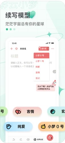 彩云小梦是一个非常有趣的黑科技智能续集应用程序,用户只需键入短短的文字,彩云小梦应用就可以为你自动继续写一个个精彩的故事,脑洞大开,续集模型丰富,内容模型丰富,帮助用户找寻更多的灵感。需要的朋友快来下载吧。