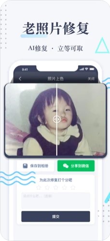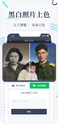 老照片修复免费版软件手机版是一款非常不错的手机重新编辑老照片软件,小时候的照片父辈小时候的照片,都是值得珍藏的宝贝,时间的推移可能会使照片变得黯淡无光,使用该手机软件可以将照片重新调整、编辑和上色,推荐下载!
