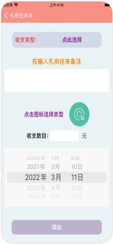 1、操作非常简单,只需要输入时间金钱数量就可以了,系统会根据用户的记录来进行自动统计。