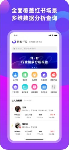 "千瓜数据"主要提供全网优质小红书达人查询等数据服务,并提供多维度的小红书达人榜单排名、达人推荐等实用功能,是一款小红书运营及广告投放效果监控的专业工具。