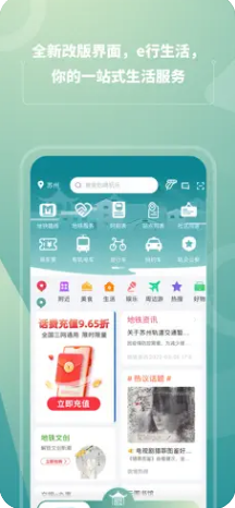 苏州游玩,就用苏e行!一码在手,畅游苏州!苏e行结合苏州城市文化及地铁出行场景,围绕 “地铁大脑” 构建公共交通智慧出行,利用LBS、物联网、大数据、人工智能等先进技术为乘客提供:扫码过闸、乘车服务、附近地铁商业,同时为苏州本地商家提供2265用户引流、活动推广等服务,构建互联网化的苏州城市生活服务。