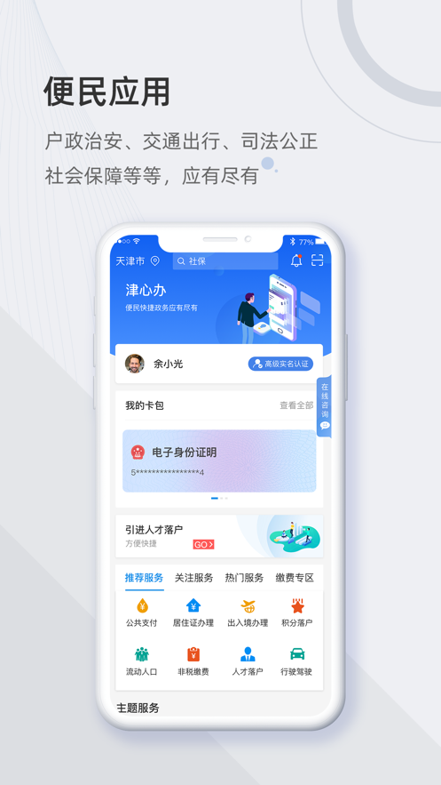 津心办APP是一款便民服务的平台。不仅可以在平台上进行政务、生活的业务办理,还可以便捷的管理个人中心,数据信息都可以轻松查看,为用户提供了各种便利的服务,打造智能高效的生活。
