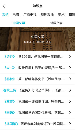 1、背文常具备训练、考试、社区交流、搜索、错题集中训练等功能,拥有文学、电影、广播电视、戏剧戏曲、美术、摄影、音乐舞蹈等专业的知识点讲解;