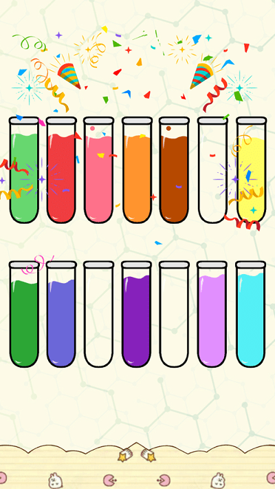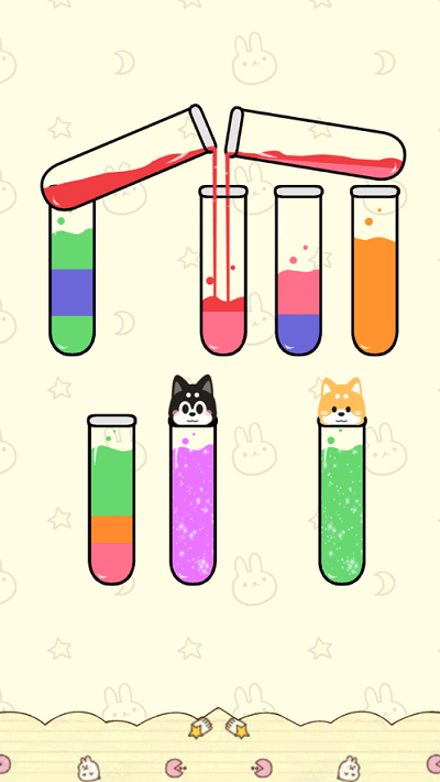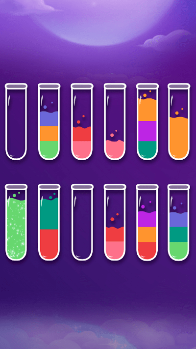 这是一个很好玩的趣味小游戏,游戏中点击试管,倾倒试管中的液体,将试管中装满同一颜色液体即可,需要注意的是:只有相同颜色的液体才可以互相倾倒入试管内。
