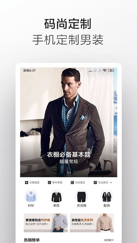 码尚定制matchu苹果版是一款能够在平台上进行服装定制的全新时尚购物软件,在这里能够根据你的身高比例来来制定适合你自己服装,西装、衬衣、大衣以及西裤等都可以在这里进行定制,还可以成为你的时尚顾问,有需要的话就来下载试试吧!