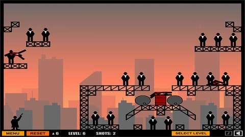 一枪杀几人2是一款画风简单但又有趣的手机游戏,在游戏里玩家将化身为神枪手,一颗子弹要发挥你的小脑袋瓜,击杀多名敌人,但是里面的子弹可以反弹,你必须精确计算如何使用最少的子弹清空所有的敌人。
