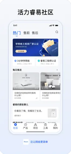 睿易APP致力于为广大工程商客户赋能,不论您是在售前阶段聊需求、讲价值、出清单,还是您在售中阶段调设备、做交付,或在售后阶段做运维,您都只要一部安装了睿易APP的手机便能搞定80%的工作,真正做到“手机在手、网络无忧”。