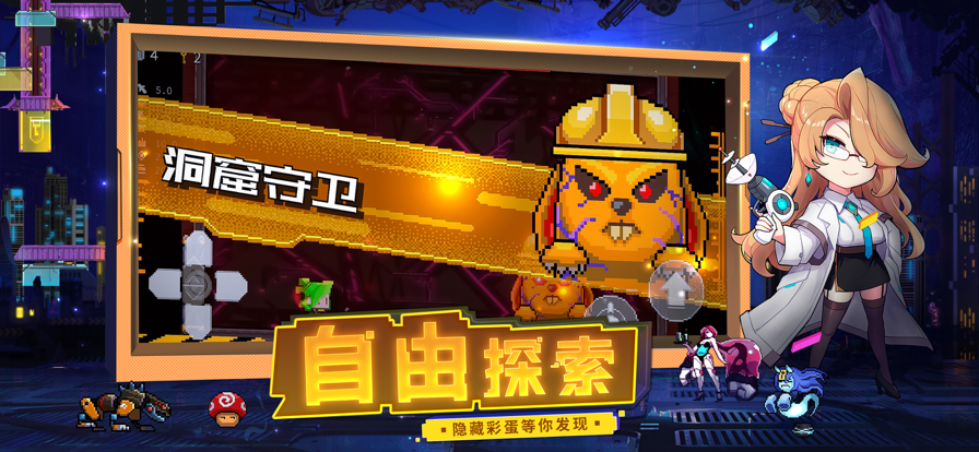 【赛博朋克画风】 科幻的赛博朋克场景,复古怀旧风的像素角色,给游戏增添了与众不同的风格魅力。