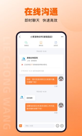 猎宠网软件是专注宠物行业的求职招聘平台,直接可以线上和老板谈,并且工作岗位非常多,可以为你精准匹配,你还可以查看附近有什么职位,平台还能对你的信息进行安全保护,防止泄露。