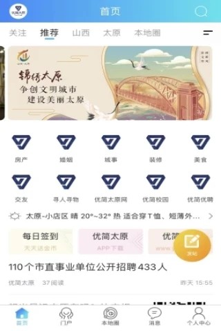 是太原本地极具人气的社交应用,本地热点新闻、爆料、新八卦,分享身边美食、晒出生活美图、参与线上线下聚会,下载优简太原 帮你快速找到 太原 共同兴趣爱好的圈子。