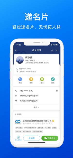 当你用手机拍照时,可以自动扫描,准确识别卡片上的信息,并快速保存到手机通讯录中。