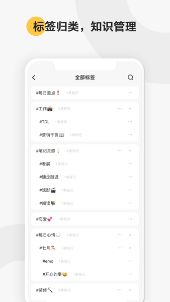 【标签归类】沿用印象多级标签体系,可对内容进行清晰归类;不仅如此,多级标签更能让您的轻记检索更加便利和高效。