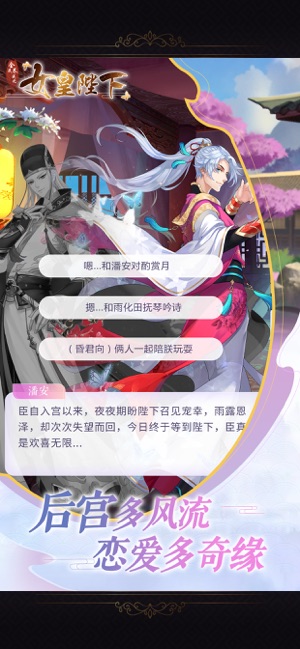 女皇陛下是一场爱的游戏。游戏中有三千个漂亮的男人。这是一款以古代风格为背景的爱情游戏。游戏的情节非常吸引人,就像在现场一样。在后宫中也有角色转换和爱情的玩法。如果你感兴趣,请下载。