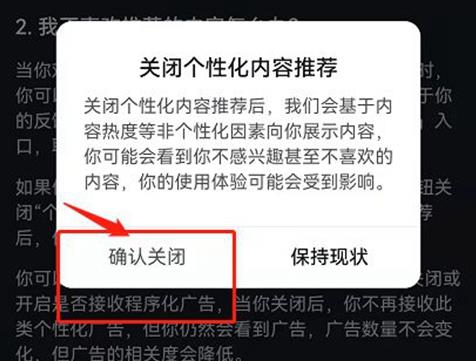5、将个性化内容推荐的按钮关闭,选择确认关闭。