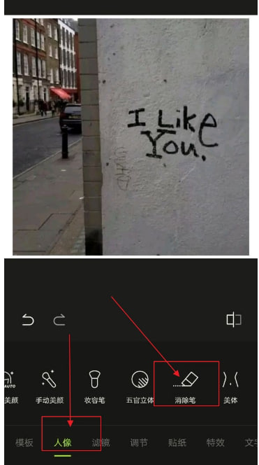 2、导入成功后,在下方点击人像,找到其中的消除笔功能。