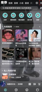 1.首先打开酷狗音乐软件,进入到主页中点击右上角的【三横】图标;