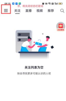 1.首先打开抖音火山版进入到首页之后点左上角的【三横】图标;