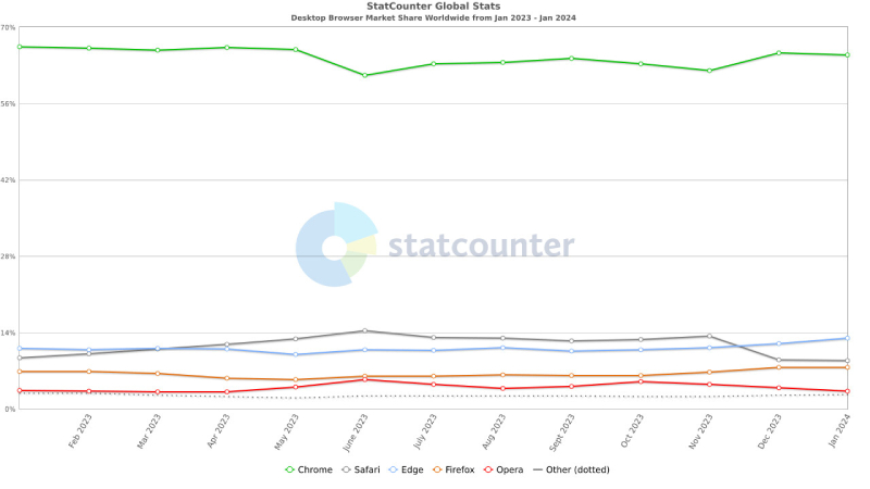 Chrome 较 2023 年 12 月末下滑 0.39%,不过目前市场份额仍然高达 64.84%,是其他浏览器市场份额总和的几倍。