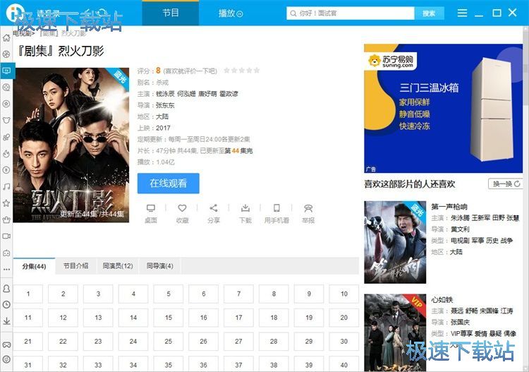 在详情页我们可以看到,《烈火刀影》已经播出了44集,有1.04亿的播放量,评分有8分,好像还不错。点击[在线观看]开始观看《烈火刀影》;