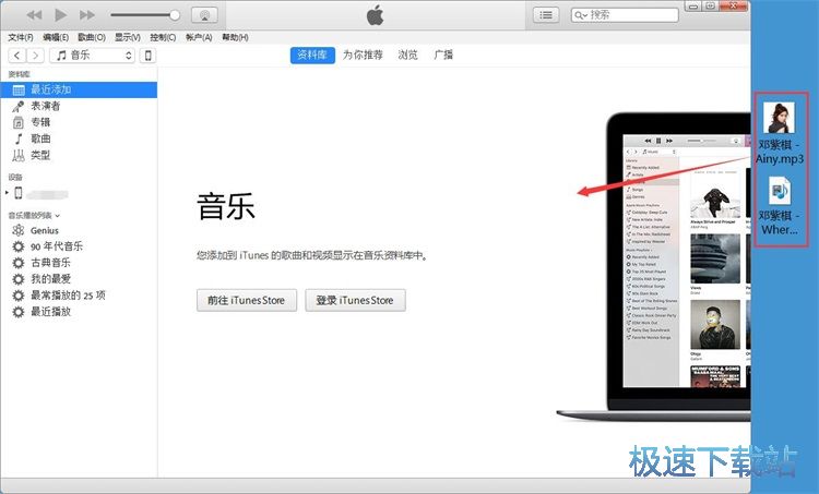 极速小编这一次就给大家演示一下怎么使用iTunes播放本地音乐文件,并将音乐文件导入到iPhone中。首先我们选中要播放的音频,用鼠标拖拽到iTunes主界面中,就可以将音乐文件添加到iTunes中;