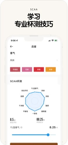 在对咖啡的风味描述上内置了SCAA标准的风味轮,您可以便捷的在风味轮上点击进行风味的辨别。最后用可视化图表的形式进行呈现,可以帮助您直观、清晰的了解杯测的结果。