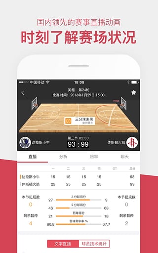 国内特有的足球、篮球赛事动画直播,场景展现生动丰富,准确即时还原赛场战况;