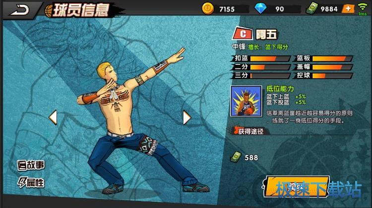 接下来是阿五,阿五的天赋是低位能力:篮下上篮+5%,篮下投篮+5%,适合战术:拥有极强的内线持球进攻能力,并且具备一定的篮板和盖帽能力,适合内外线兼顾的组合